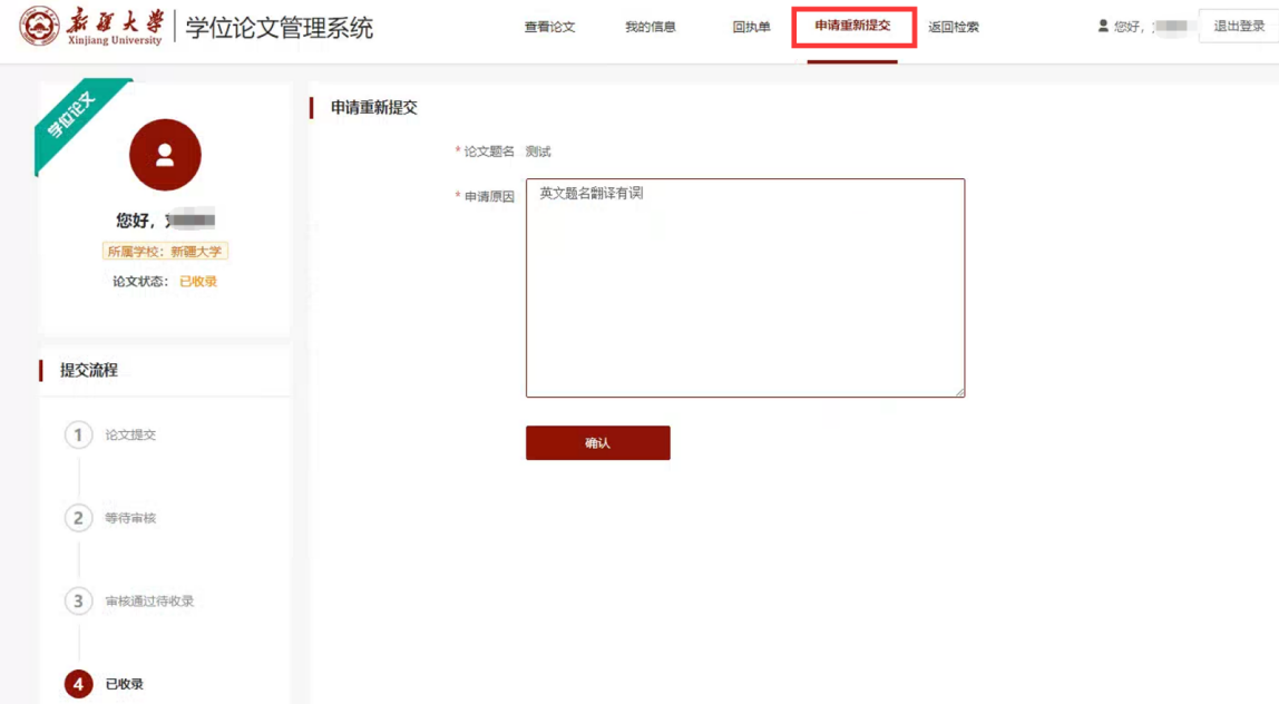 第六步:重新提交申请:审核通过的论文,如需修改,采用“申请重新提交”的方式,并经过老师审核后,方可再次进行修改