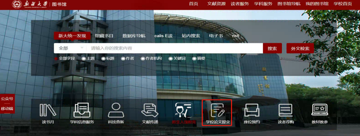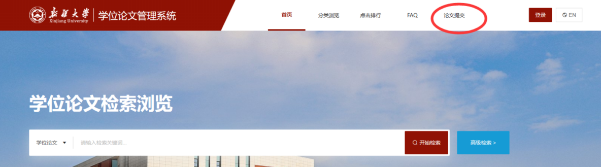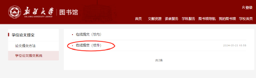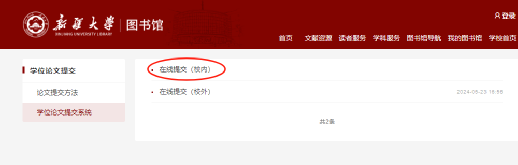 第一步:从图书馆主页https://lib.xju.edu.cn/进入点击“学位论文提交”--“学位论文提交系统”--“在线提交(校内)”/“在线提交(校外)”
