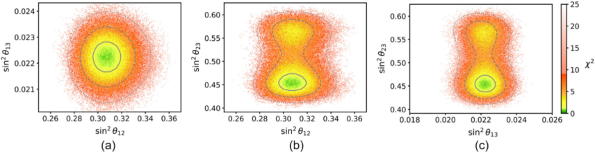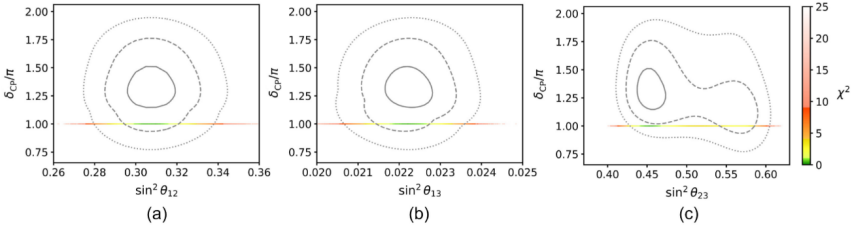 图4. 狄拉克CP破坏相位δCP与中微子混合角sin²θ₁₂、sin²θ₁₃和sin²θ₂₃的关联。模型预言(散点)显示δCP的值稳定集中在π附近,为未来中微子实验检验该模型提供一个清晰、可验证的预言。