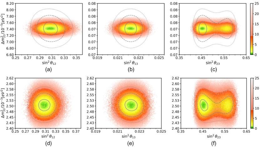 图3.中微子质量平方差与混合角的关系。模型的理论预言(彩色散点)与实验观测的允许范围(背景中的实、虚、点划线区域)高度吻合。