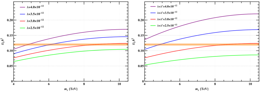 图5.暗物质残留密度与质量的关系。理论预言表明,在特定的暗物质质量与微小的耦合强度下(λ, λ' ~ 10⁻¹²),其残留密度可精确吻合普朗克卫星的观测结果(橙色区域),从而为宇宙暗物质的起源提供了一种解释。