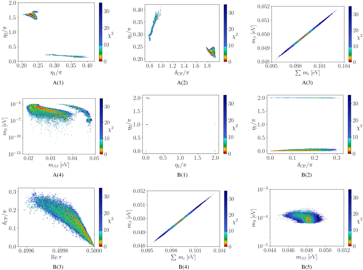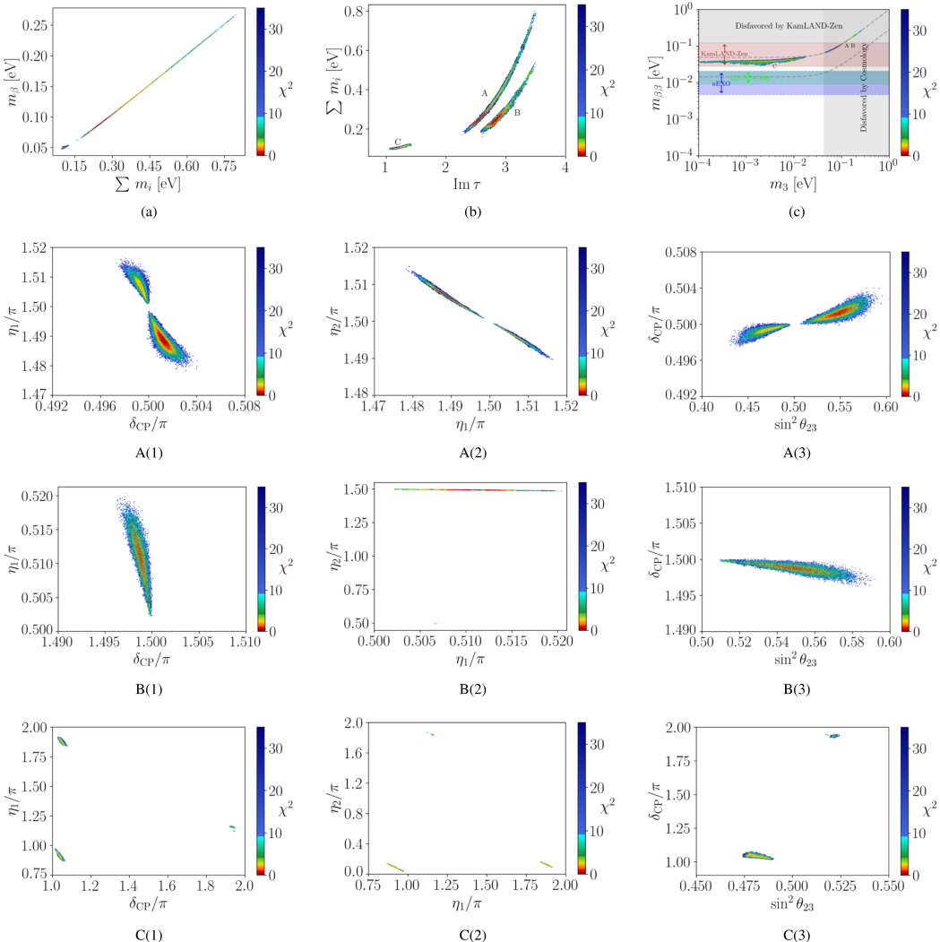 结合广义CP对称性约束,我们在复模参数τ的基本域内进行系统性扫描,找到多个与当前中微子振荡数据高度吻合的可行区域(图1)。数值分析表明,不同τ区域对应着独特的中微子质量顺序、混合模式与CP破坏行为,并进一步给出对若干待测定物理量的预言,包括狄拉克CP相位、马约拉纳相位、绝对中微子质量尺度(图2-7),以及无中微子双贝塔衰变中的有效质量mββ (图8)等。