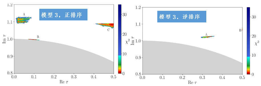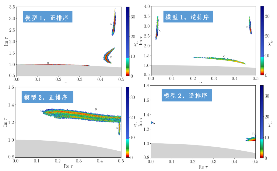 图1. 模参数τ在基本域内的可行空间分布。区域A、B和C标记能够重现当前中微子振荡数据的参数解,颜色深浅对应与实验数据的符合程度(2值)。