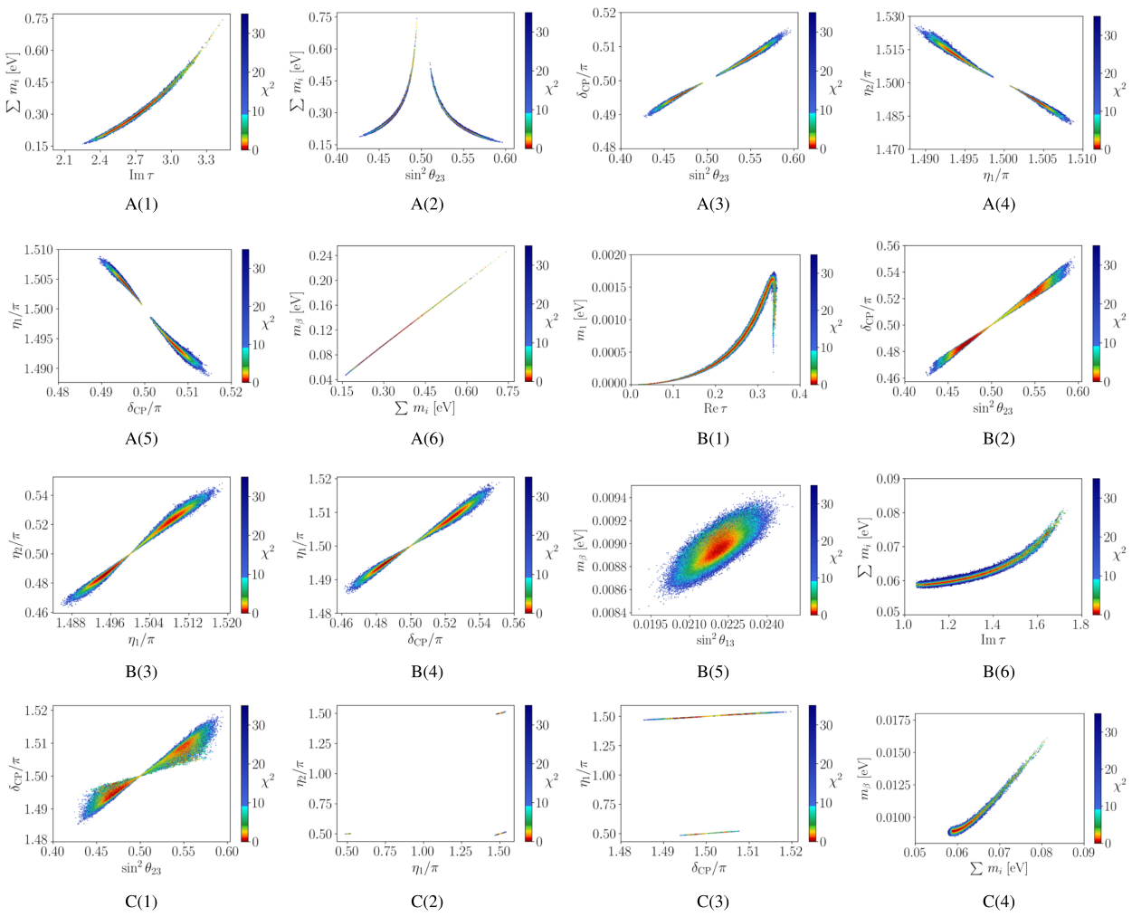 图3. 模型1在逆质量排序下的中微子参数关联与分布,其参数关系与图2所示正序情形形成对照。