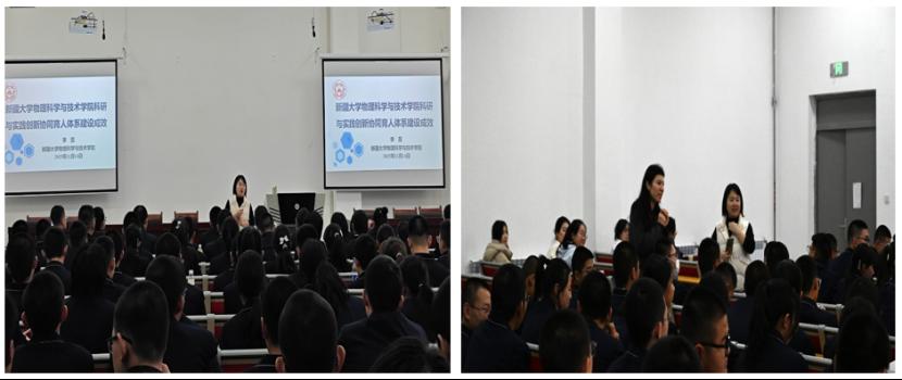 活动伊始,学院学术副经理李蕊老师代表学院对新疆实验中学师生一行表示热烈欢迎,并围绕“科研与实践创新协同育人体系建设成效”展开详细介绍。报告从学院学科布局、团队力量、科研平台搭建、人才培养模式等维度,重点讲解了学院如何通过“科研项目驱动教学、实践平台支撑创新”,实现理论教学与科研实践的深度融合,同时分享了学院在物理领域的代表性成果与员工成长案例,让在场学子对高校物理学专业学习及未来发展方向有了清晰认知,进一步点燃了对物理学科的探索兴趣。