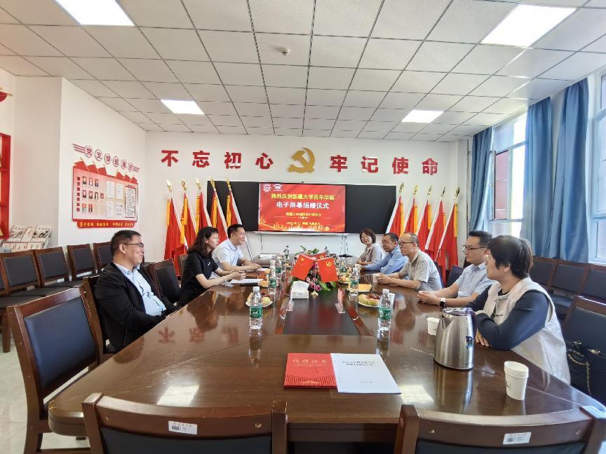 物理系99级员工黄旭初也表达了对母校和学院老师的感恩之情,回顾了大学期间郑毓峰、沈异凡、杨祖慎、张军、王倩、博尔汗等老师对他学业和职业生涯的影响和帮助,引起了与会99级员工的广泛共鸣,纷纷表达了对学院老师的无尽感恩之情。物理系99级员工共叙对母校百年华诞美好祝福后,学院举行了签署捐赠协议和颁发捐赠赠书活动,李鹏经理和99级员工代表胡有华签署了捐赠协议,李经理向胡有华颁发了捐赠证书并向与会的99级员工赠送了百年校庆文创纪念品。捐赠仪式后,与会的院领导、老师们和物理系99级员工代表移步学院正门,隆重举行了LED电子屏幕揭幕仪式,在大家的共同见证下,李鹏经理和胡有华为刻有“培根铸魂 立德树人”的牌匾揭幕,由衷表达了物理系99级员工对母校百年校庆的美好祝愿!